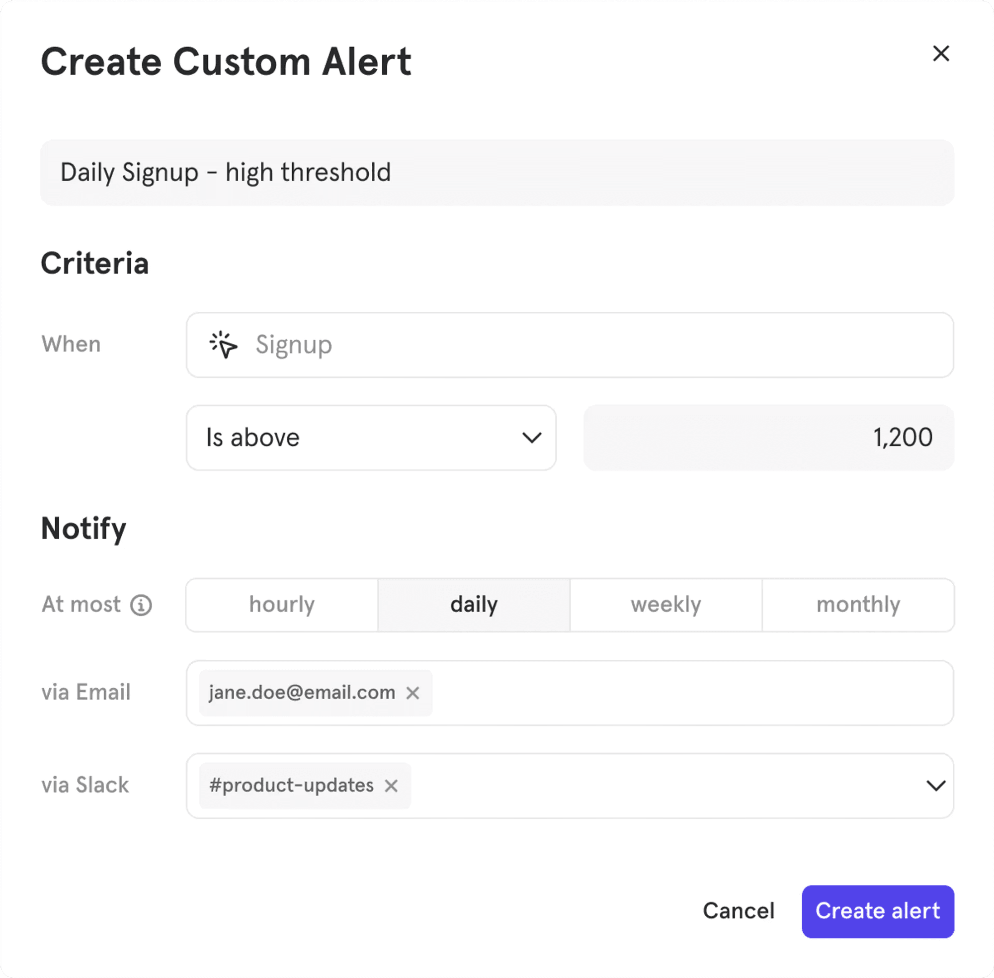 Create an alert for your Insights and Funnels reports and be notified when report conditions reach certain thresholds. Alerts are sent as an email or Slack message and can be sent to multiple users. To create an alert follow these steps: